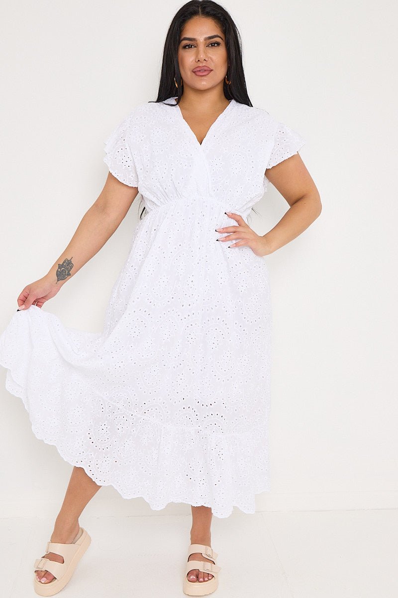 Plus Size White Broderie Lace Wrap Top Frill Hem Dress - Curvy Chic Boutique